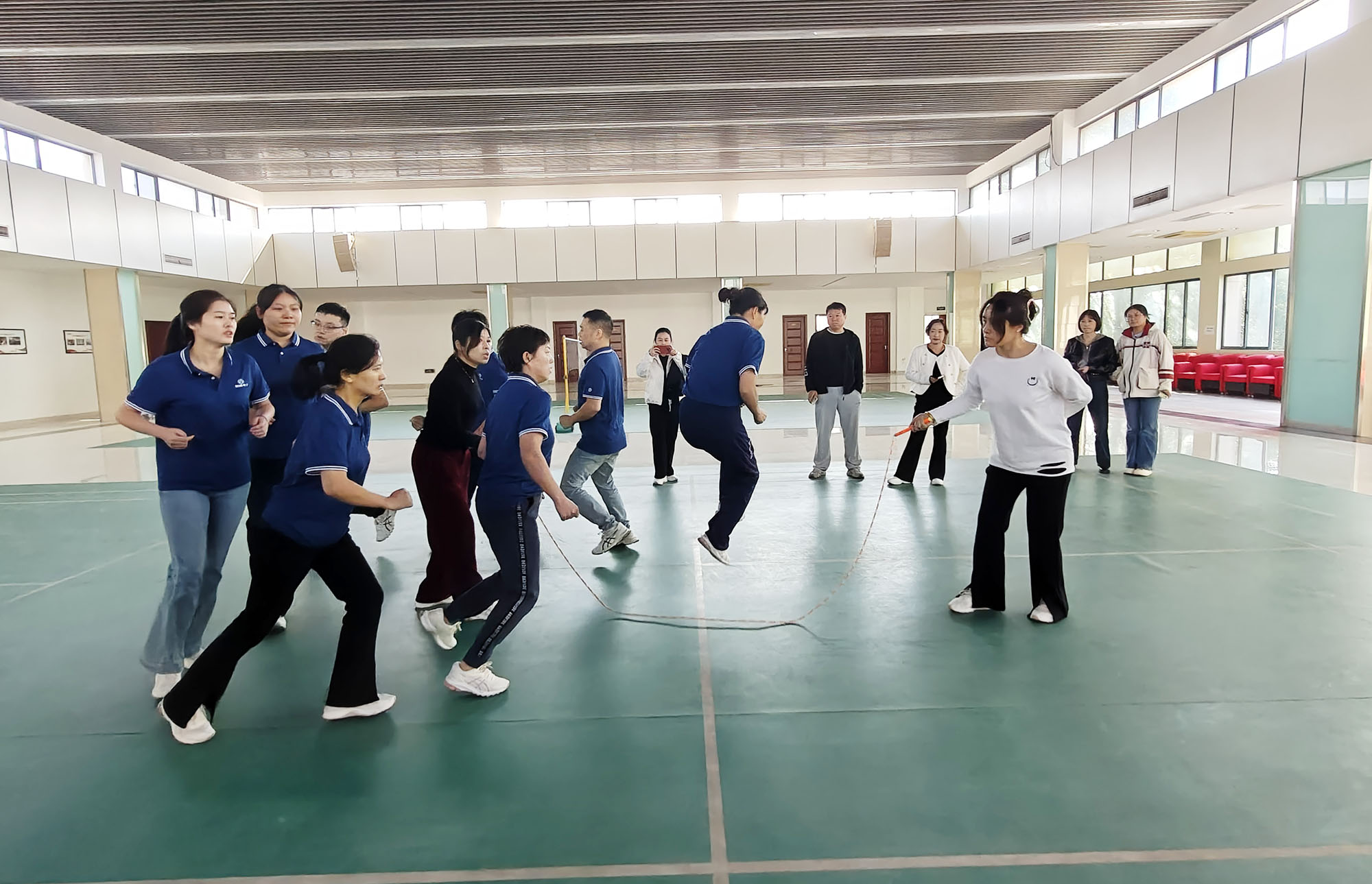 十人八字跳绳是一项极具挑战性的集体协作项目,摇绳的队员双臂有力摆动,精准掌控节奏;跳绳队员则如灵动的燕子,在绳间穿梭自如,形成一道道优美的弧线。