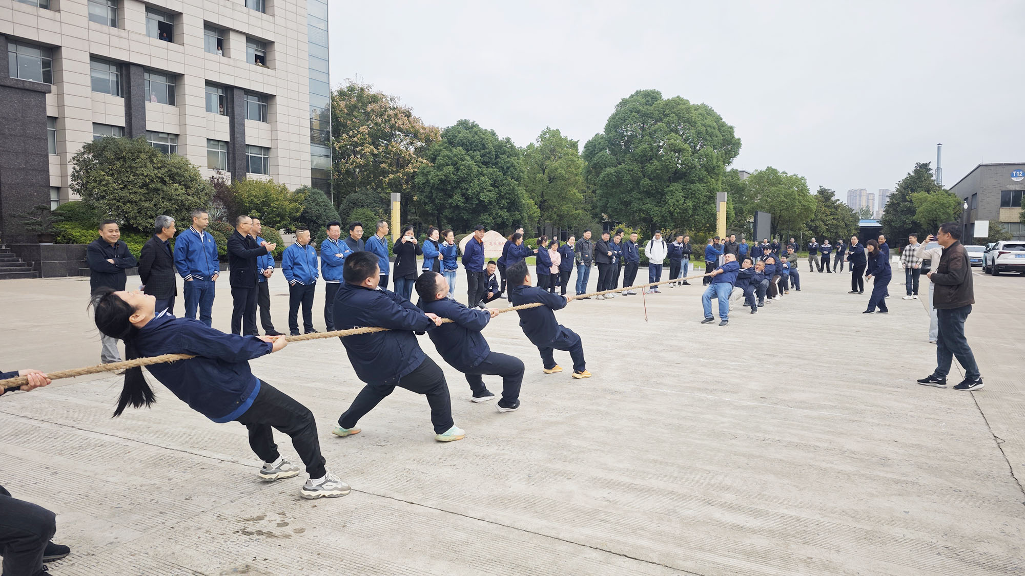 在拔河项目中,队员们将彼此的力量与长绳融为一体,身体后倾成整齐的斜线,双脚如钉般扎根地面,将团队的合力凝聚在手中的绳索之上。